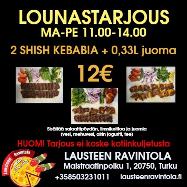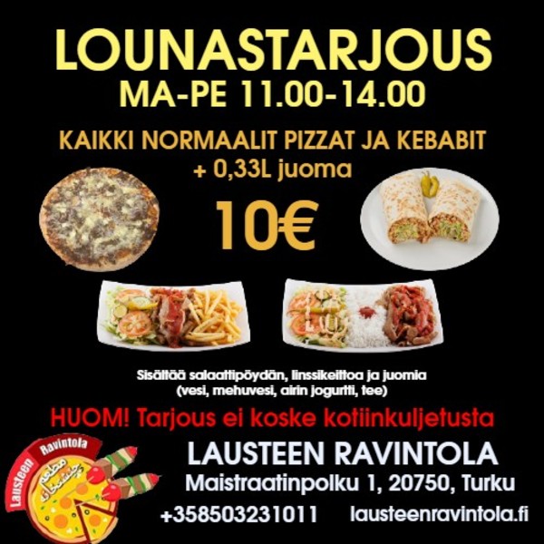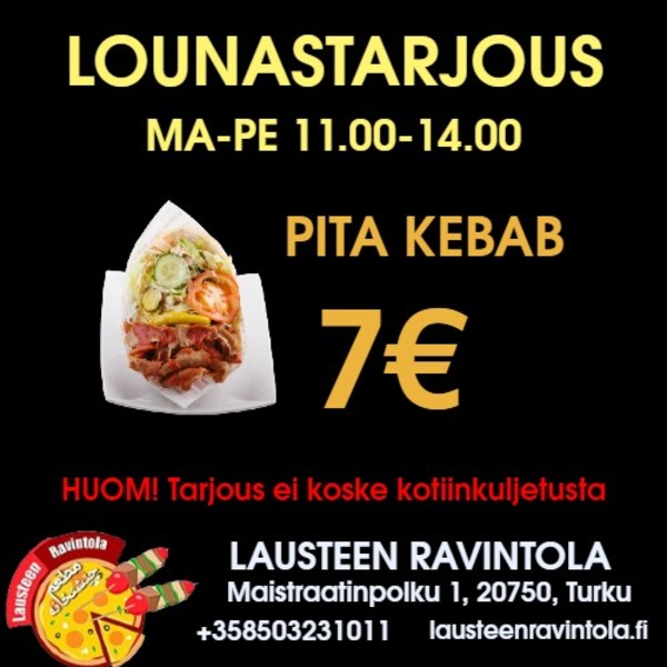 +358 50 323 1011 Home delivery 14:00-21:30 Pick-up from the restaurant 11:00-22:00